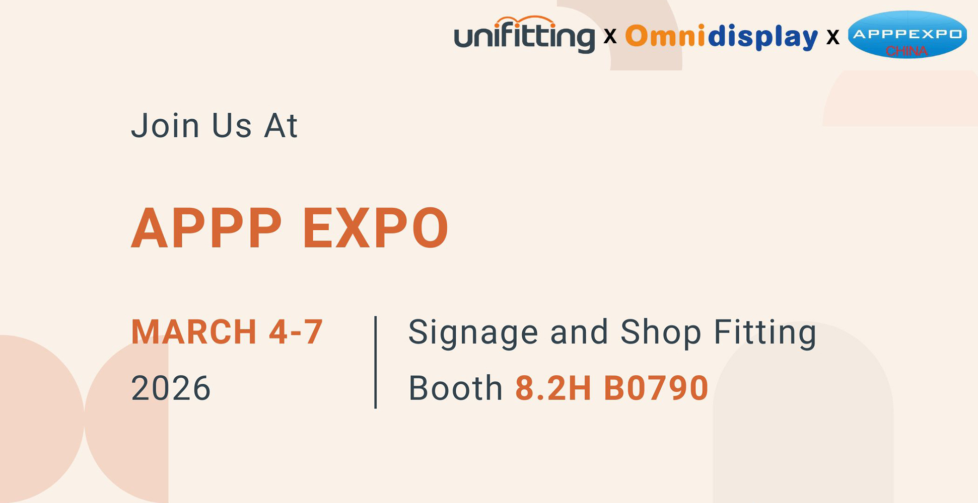 See you in Shanghai — Booth 8.2H B0790 (Signage & Shop Fitting), March 4–7, 2026.We're excited to announce that Unifitting × Omnidisplay will exhibit at APPPEXPO Shanghai 2026 from March 4–7, 2026 at the National Exhibition & Convention Center (Shanghai).